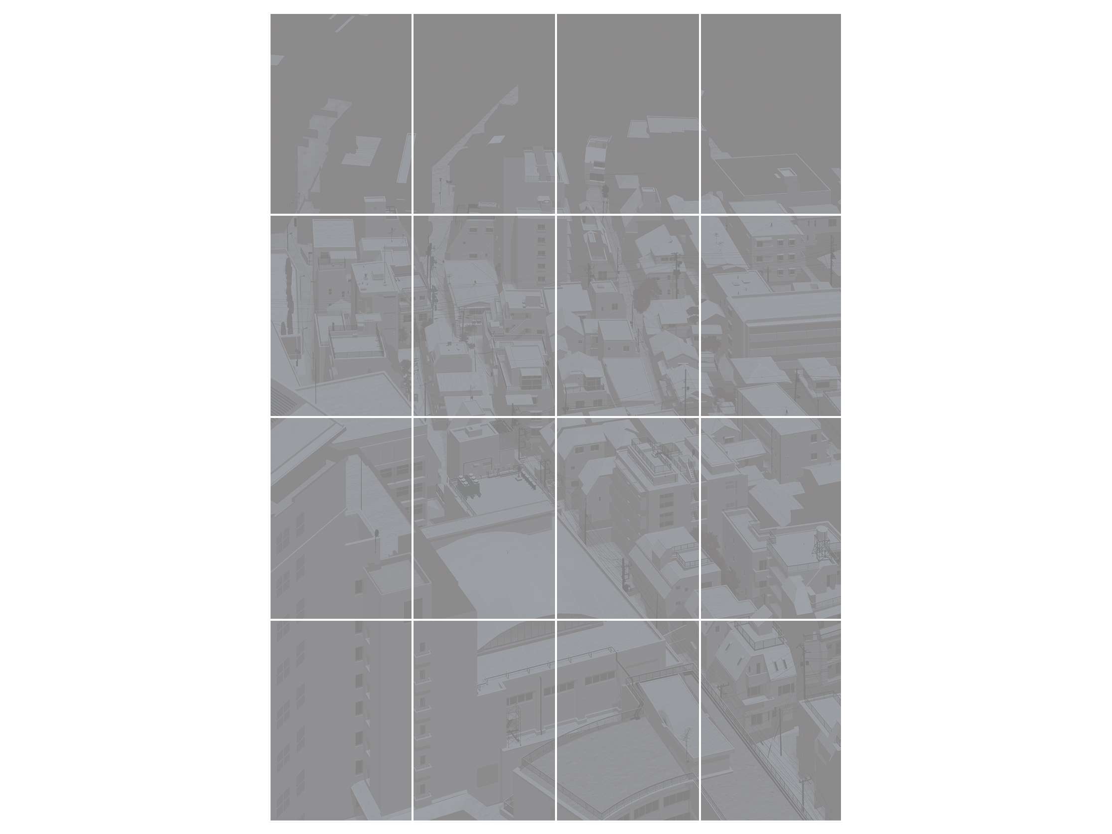 The work TECHNICOLOR is based on 2010 photography from the Tokyo Observatory. I recently discovered the colours in the otherwise very underexposed photography. The snow was added by hand, roof by roof.